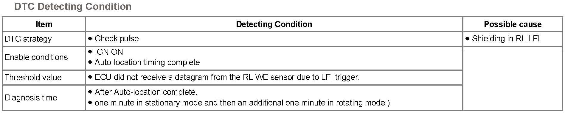 This DTC indicates that Auto-location timing is completed AND ECU did not receive a datagram from the Rear Left WE sensor due to LFI trigger. The most likely cause is a transmission obstacle.