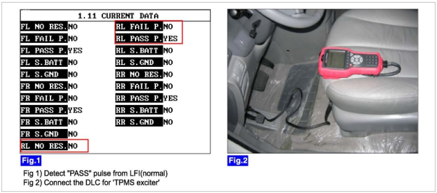 4. Monitor the parameters of 'Rear Left' LFI on the 'TPMS exciter' or scantool.