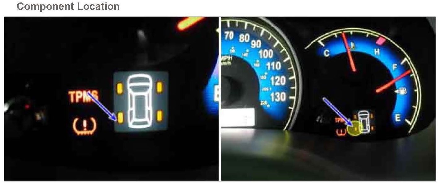 The TPMS display device is located on the instrument cluster to provide information about TPMS operating conditions and tire pressure. The TPMS display device is consist of TREAD indicator lamp, Location lamp and TPMS Warning indicator lamp. The TREAD indicator lamp is turned on when pressure of one or more tires are below the warning limit level. And then, the location lamp displays the tire position that is the pressure below the warning limit level. The TPMS Warning indicator lamp is turned on if there is the failure in the system.