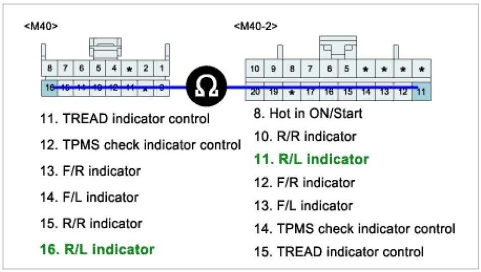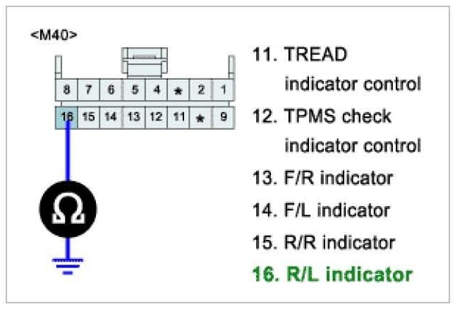 7. Measure resistance between terminal "16" of TPMS receiver harness connector and terminal "11" of instrument cluster harness connector.