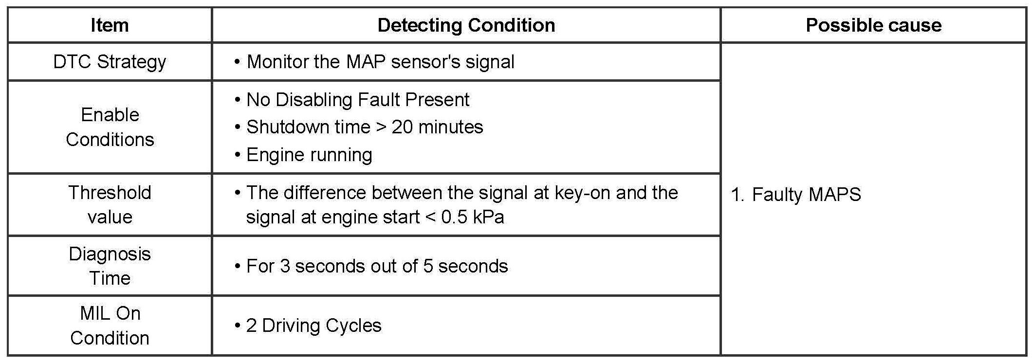 If the signal output of MAP sensor is stuck under enable conditions, PCM determines that a fault exists and a DTC is stored. MIL(Malfunction Indication Lamp) turns on when the malfunction lasts till consecutive 2 driving cycle.