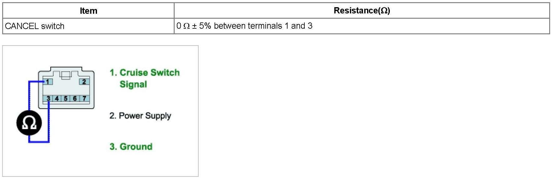 2. Measure resistance between terminals 1 and 3 of auto cruise switch connector with "CANCEL" switch depressed. (Component side)