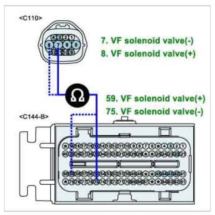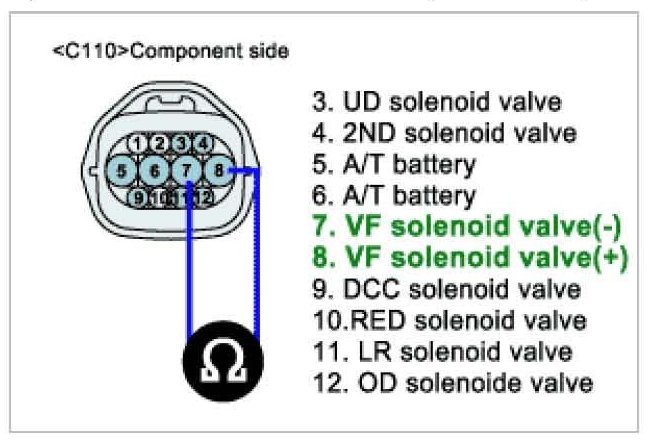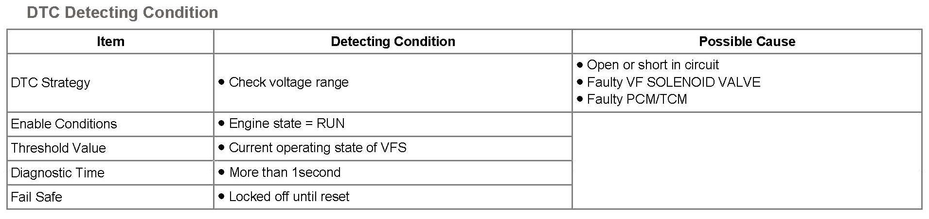 The TCM checks the VFS Control Signal by monitoring the feedback signal from the solenoid valve drive circuit. If an unexpected signal is monitored (for example, high voltage is detected when low voltage is expected, or low voltage is detected when high voltage is expected), the TCM judges that the Low and Reverse control solenoid circuit is malfunctioning and sets this code.