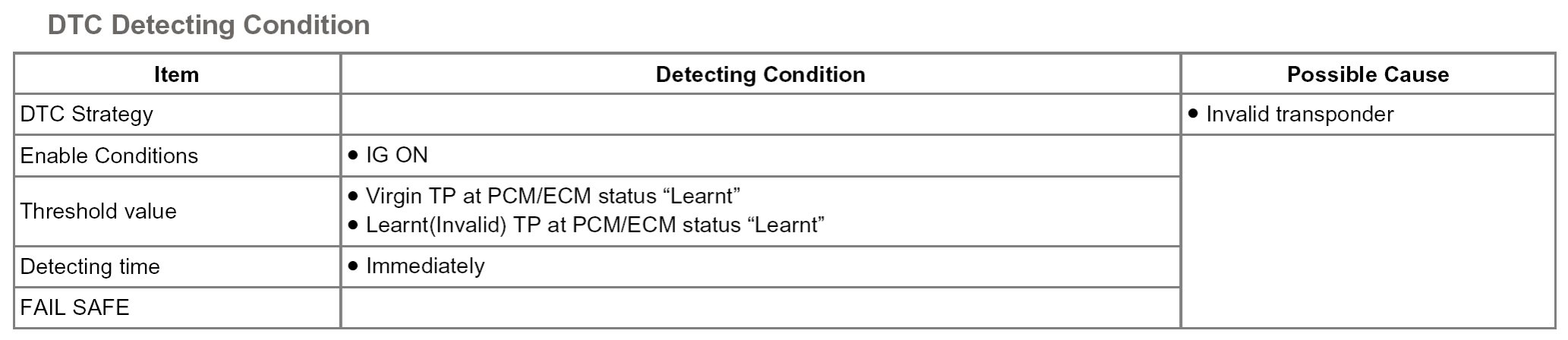 The ECM sets DTC P1674 if transponder key that can't be register (TP not in the password mode or whose transport data has been changed) is inserted for registration procedure.