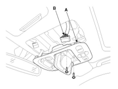 2. Remove the lens and open the sunglass case cover from the overhead console then remove the 2 screws holding the overhead console. And disconnect the connector then remove the overhead console lamp assembly from the headliner.