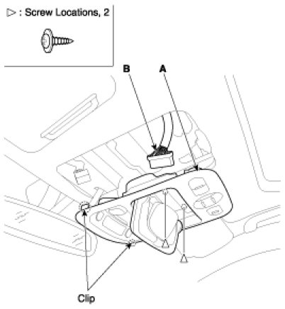 Loosen the overhead console mounting screws, remove the overhead console assembly (A).
