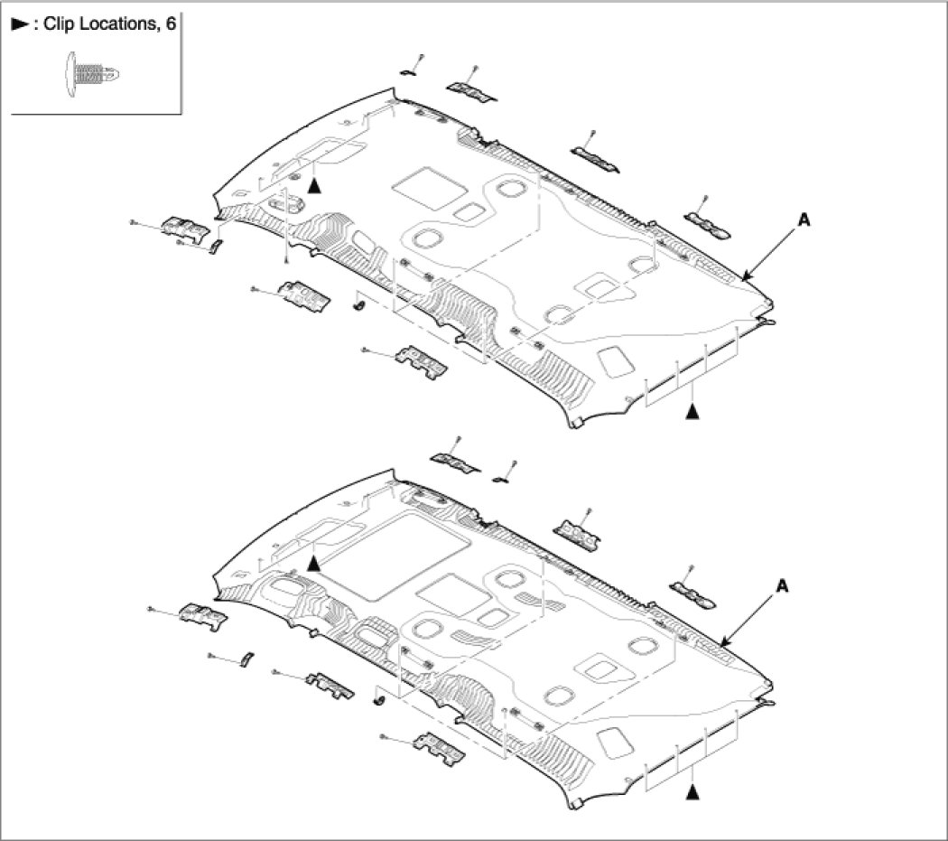 2. Using a clip remover, detach the clips, and remove the roof trim (A).