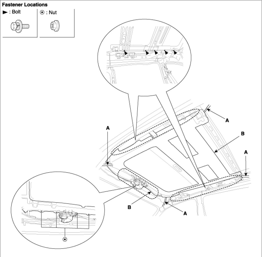 3. After loosening the mounting bolts and nuts, remove the sunroof assembly (B).