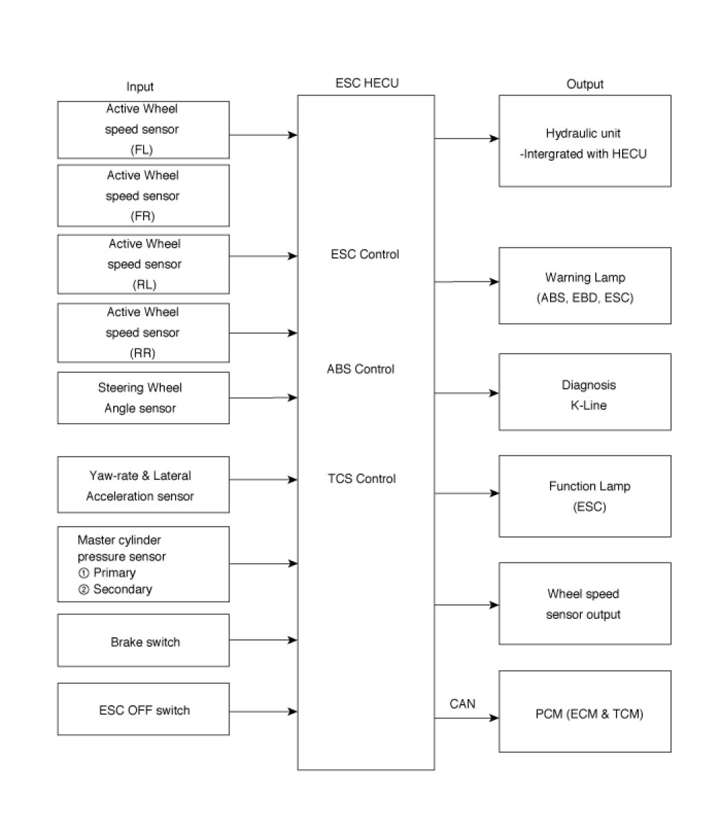 After the key-on, the ECU continually diagnoses the system failure. (self-diagnosis)If the system failure is detected, the ECU informs driver of the system failure through the BRAKE/ABS/ESC warning lamp. (fail-safe warning)