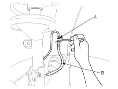2. Tighten the brake tube (A) nut holding the brake hose (B) nut with a wrench.