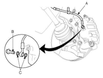 1. Install the brake hose (A) connecting bolt (B) and washer (C).