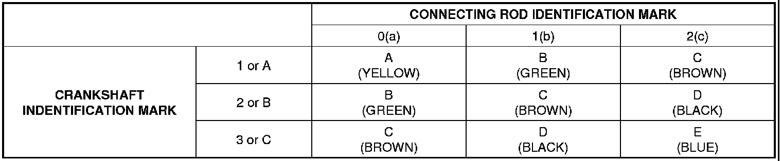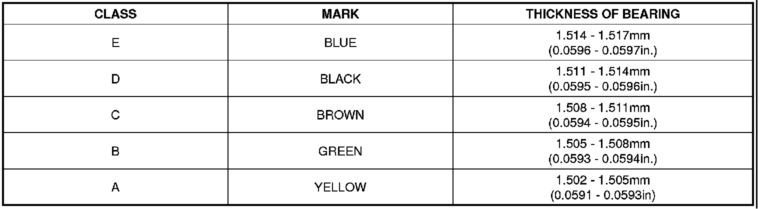 (6) If the plastigage measures too wide or too narrow, remove the upper half of the bearing, install a new, complete bearing with the same color mark (select the color as shown in the next column), and recheck the clearance.