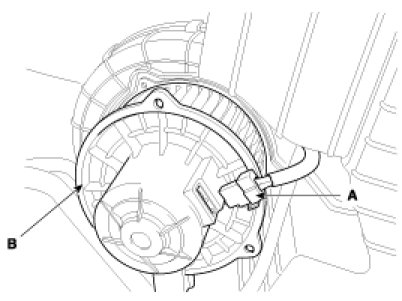 3. Remove the blower motor (B) after loosening the mounting screws.