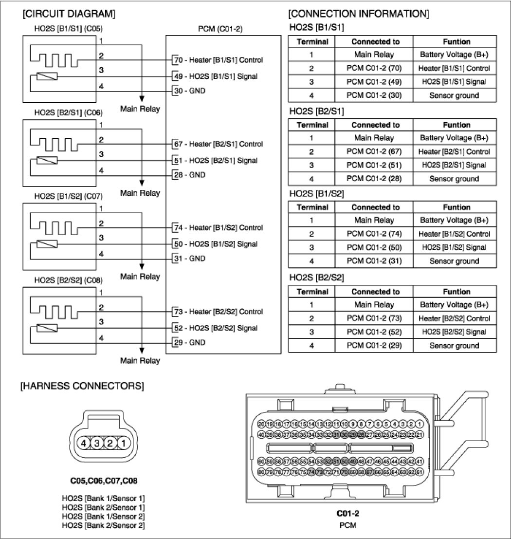 Heated Oxygen Sensor (HO2S) consists of zirconium and alumina and is installed on upstream and downstream of the Manifold Catalyst Converter (MCC). After it compares oxygen consistency of the atmosphere with the exhaust gas, it transfers the oxygen consistency of the exhaust gas to the PCM. When A/F ratio is rich or lean, it generates approximately 1V or 0V respectively. In order that this sensor normally operates, the temperature of the sensor tip is higher than 370°C (698°F). So it has a heater which is controlled by the PCM duty signal. When the exhaust gas temperature is lower than the specified value, the heater warms the sensor tip.