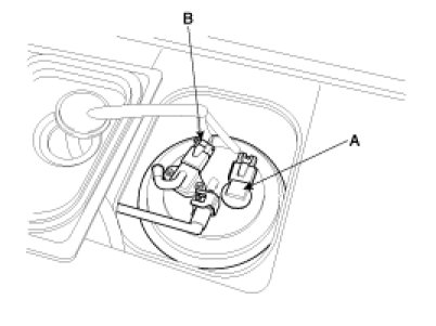 2. Disconnect the fuel pump connector (A) and the fuel tank pressure sensor connector (B).