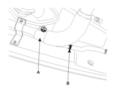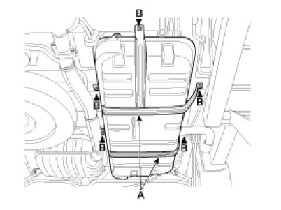 6. Remove the fuel tank band (A) with unscrewing the mounting bolts (B) and remove the fuel tank from the vehicle.