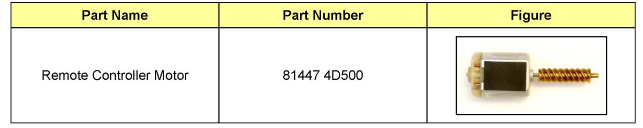 Follow the diagnostic procedure in the service information: Body Electrical System > Power Door Locks > Power Door Lock Actuator. If it is determined that the actuator motor is defective, it is only necessary to replace the actuator motor with part number 81447 4D500. Do Not replace the Remote Controller Assembly for this concern.