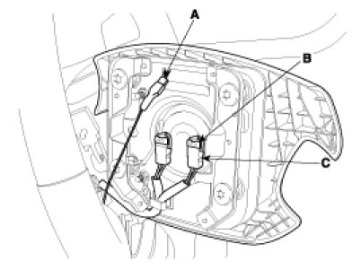 4. Release the connector locking pin(B), then disconnect the driver airbag module connector(C).