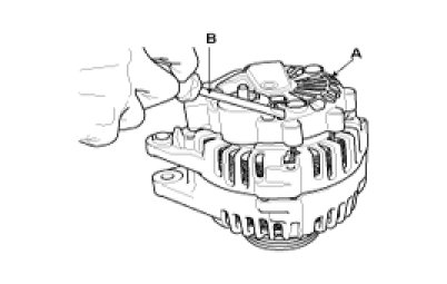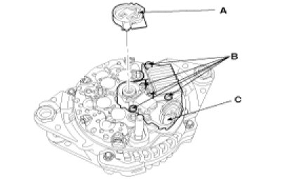 3. Loosen the mounting bolts(B) and disconnect the brush holder assembly(C).