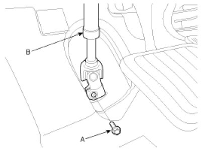 9. Loosen the bolt (A) and then disconnect the universal joint assembly (B) from the steering gear assembly.