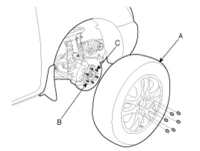 Be careful not to damage the hub bolts (C) when removing the front wheel and tire (A).