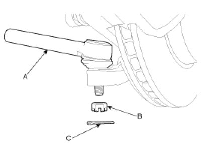 5. After removing both sides of the tie rod end (A) self-locking nuts (B) and cotter pin (C), remove the ball joint by using the special tool(09568-4A000).