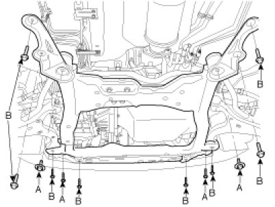 5. After lifting the jack which supports the sub frame, install the four bolts (A) of the sub frame and the eight bolts (B) of the guide bracket.