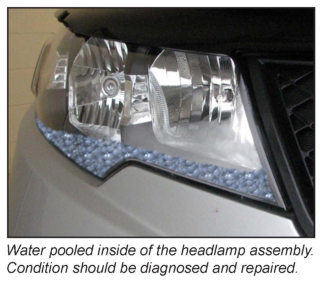 If water pools at the bottom of the headlamp assembly or if fogging remains after the headlamps have been left on for more than 30 minutes with the engine running, this condition may be caused by a water leak. The condition should be diagnosed, and repaired as needed. Such a condition may result from a poor seal between the housing and lens or socket, from cracks in the headlamp assembly, or from a poor fit.