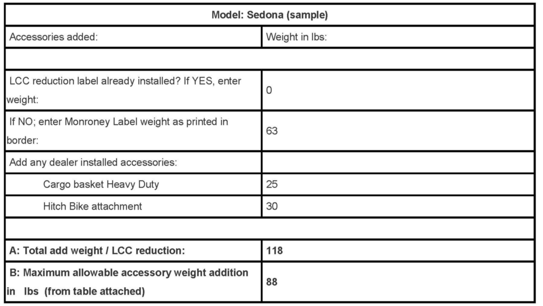 Attachment 1: allowable maximum weight addition without LCC labeling, per model, in lbs.