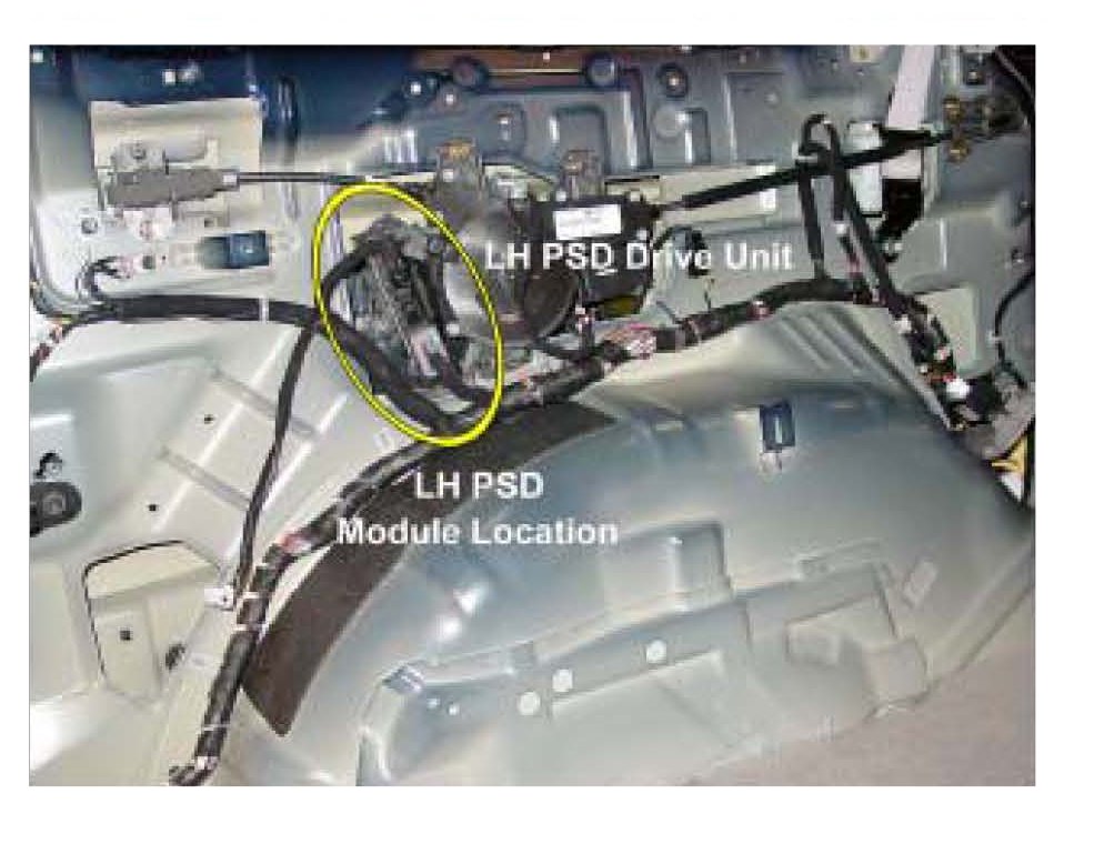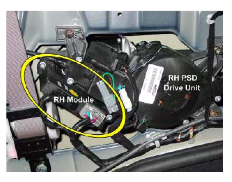 A close-up view of the RH (passenger's side) PSD drive unit and control module is shown. The module is attached to the PSD drive unit in a similar, but slightly different area.