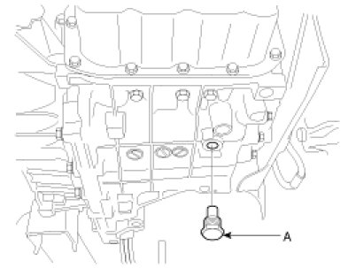 3. Remove the drain plug(A) from the bottom of the transmission case to drain the fluid.
