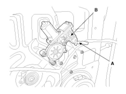 3. Remove the window motor (B) after disconnecting the motor connector (A) and mounting nuts.
