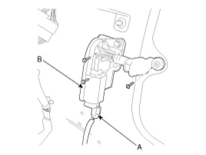 3. Remove the quarter glass motor (B) after disconnecting the motor connector (A) and quarter glass motor mounting bolts and screws.