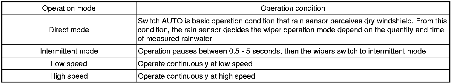 The Rain sensing windshield wiper system is a wiper system that, in addition to providing normal wiper functions off, mist, manual low speed, manual high speed, and wash, provides automatic control of automatic intermittent automatic low, and automatic high speeds.