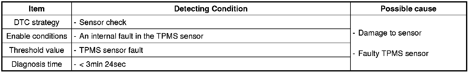 When 4 sensors have been learned as road wheels, it shall not be possible to learn new road wheel sensors on the same Ignition cycle. In normal mode low line, tire pressure and temperature shall be transmitted every 3 minutes 20 s nominally independent of vehicle operation. Monitoring shall be every 20 s. If sensor detects rapid deflation, then RF messages will be transmitted every 4 s for 1 minute duration. Communication from wheel sensors shall be via RF at a frequency of 315 MHz, 5 kBaud. Tire pressure measurement tolerance shall be ±7 kPa from 0 to 50 °C and ±17.5 kPa from -40 to 120°C with a range of 100 to 450 kPa. Tire temperature measurement tolerance shall be ±3 °C from -20 to 70 °C and to ±5 °C from -40 to 120 °C.
