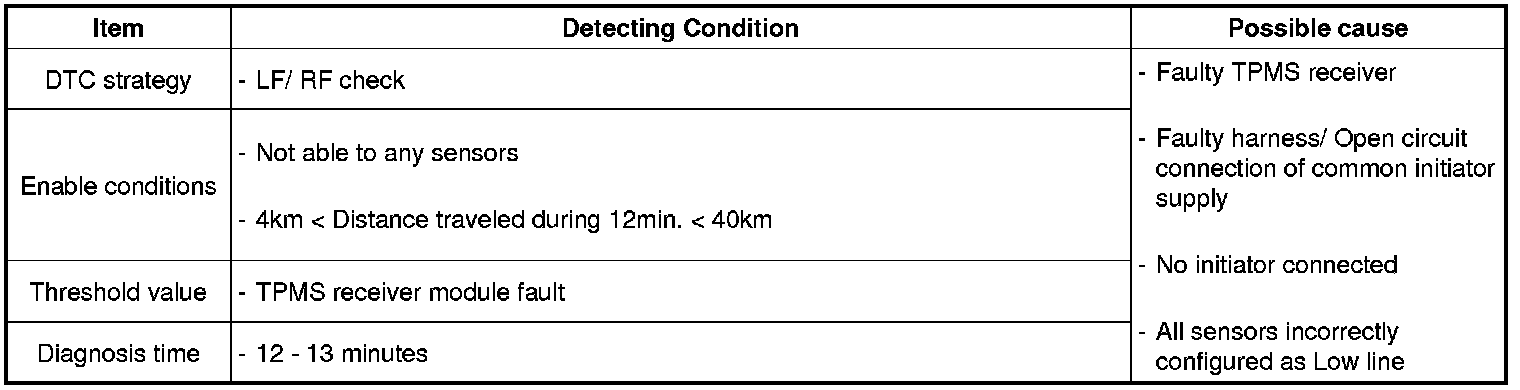 TPM Receiver is integrated with the TPM module installed at the bottom of the steering column. The operating battery of TPM module is supplied from the vehicle battery. Data such as Tire pressure, Tire Temperature, TPM sensor battery status and TPM sensor valve ID from TPM sensors are transmitted to TPM receiver in the form of RF signal. TPM module accomplishes Tire Monitoring and Warning Logic with received data.