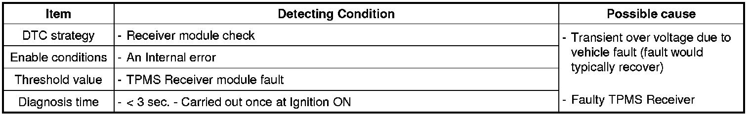 TPM Receiver is integrated with the TPM module installed at the bottom of the steering column. The operating battery of TPM module is supplied from the vehicle battery. Data such as Tire pressure, Tire Temperature, TPM sensor battery status and TPM sensor valve ID from TPM sensors are transmitted to TPM receiver in the form of RF signal. TPM module accomplishes Tire Monitoring and Warning Logic with received data.