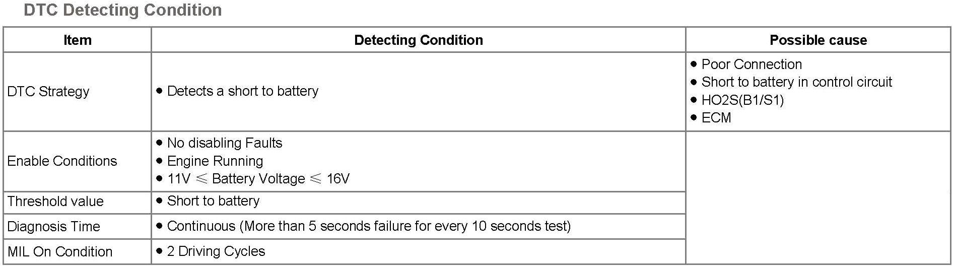 If the ECM detects short to battery in heater under detecting conditions, ECM sets P0032. MIL (Malfunction Indication Lamp) turns on when the malfunction lasts till consecutive 2 driving cycle.