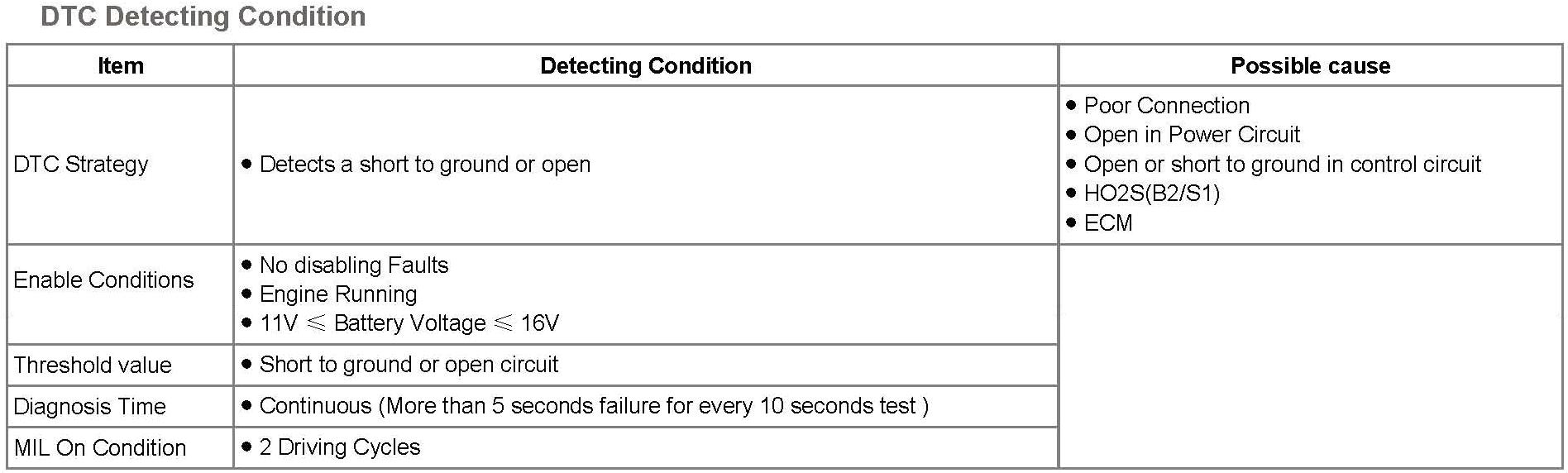 If the ECM detects short to ground or open in heater under detecting conditions, ECM sets P0051. MIL (Malfunction Indication Lamp) turns on when the malfunction lasts till consecutive 2 driving cycle.