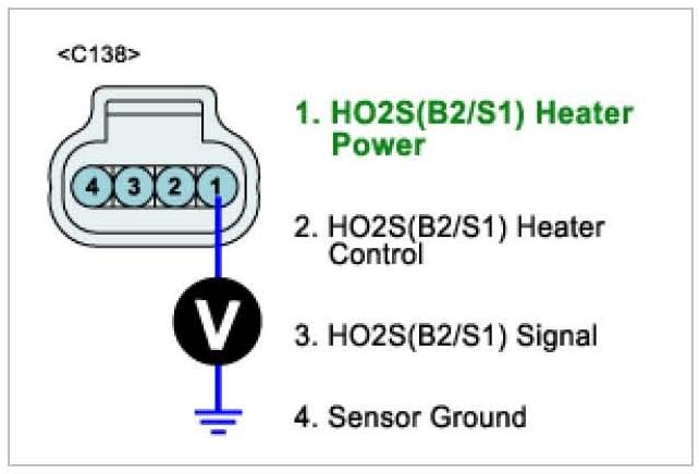 3. Measure voltage between terminal 1 of HO2S (B2/S1) harness connector and chassis ground.