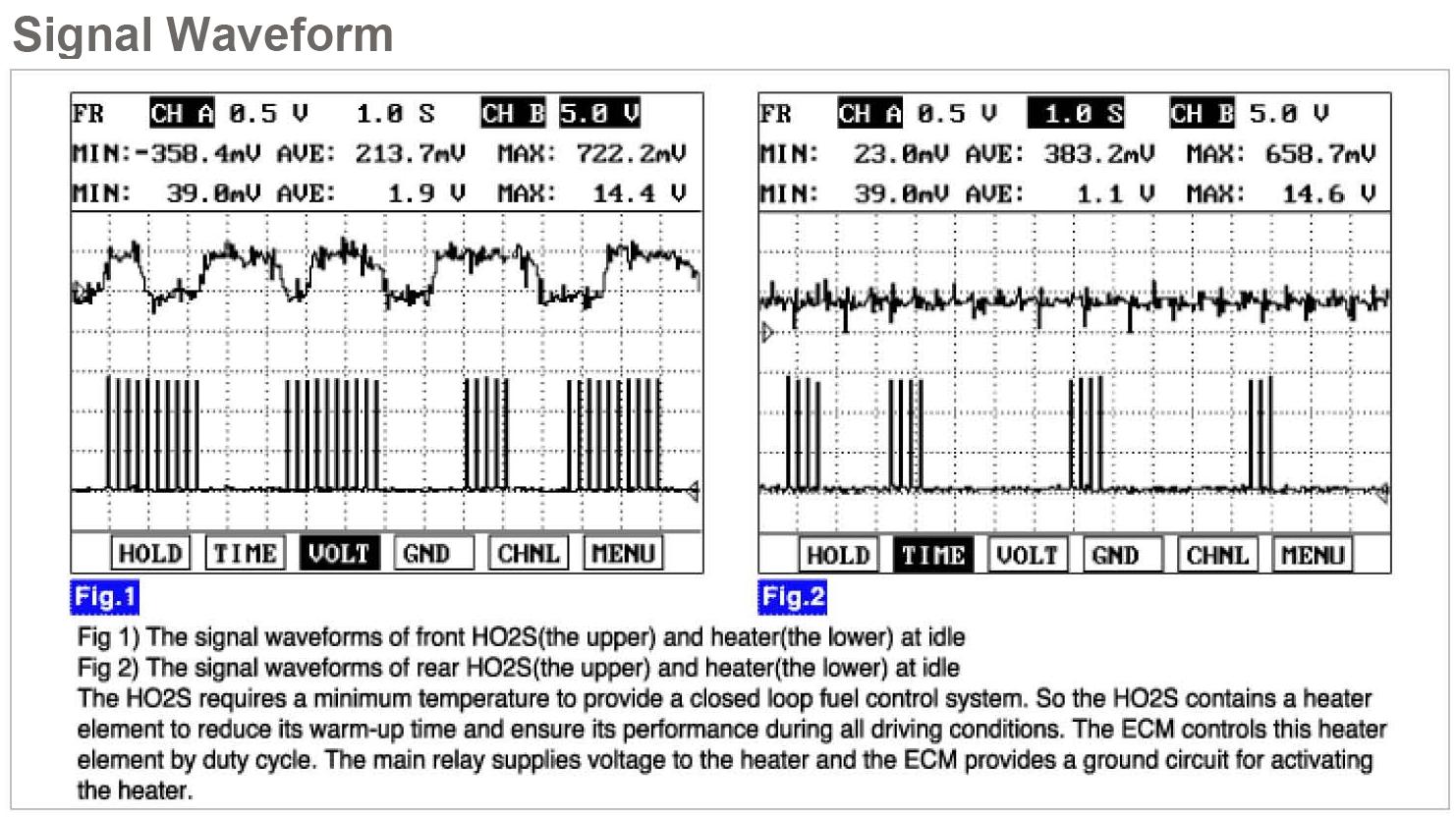 The normal operating temperature of the HO2S (Heated Oxygen Sensor) ranges from 350 to 850 °C (662 to 1562 °F). The HO2S heater greatly decreases the amount of time required for fuel control to become active. The ECM provides a pulse width modulated control circuit to adjust current through the heater.