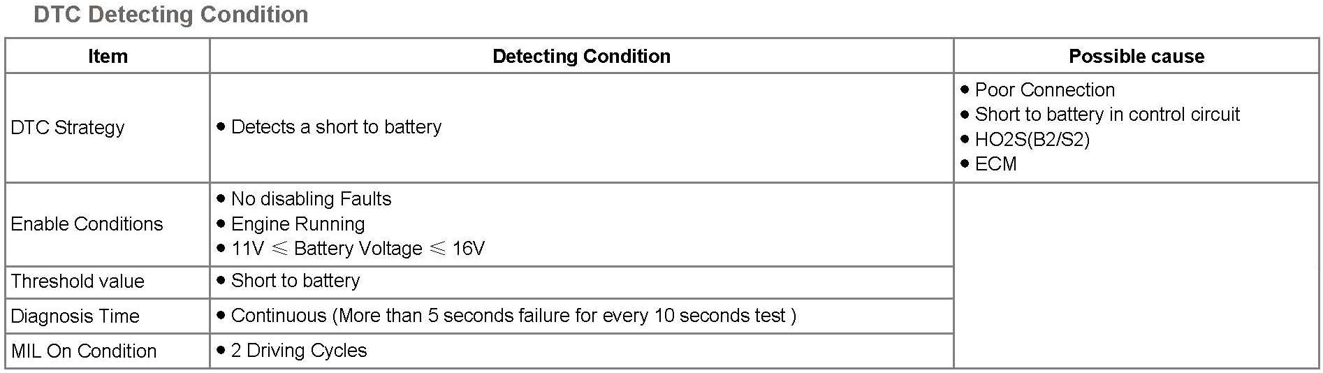 If the ECM detects short to battery in heater under detecting conditions, ECM sets P0058. MIL (Malfunction Indication Lamp) turns on when the malfunction lasts till consecutive 2 driving cycle.