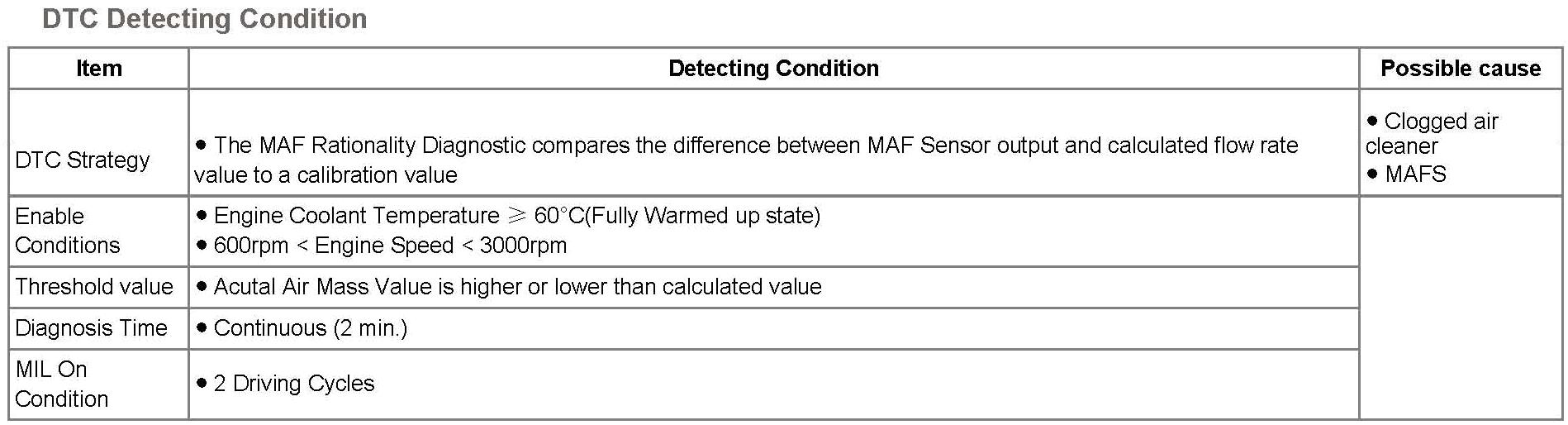 The difference between values coming from the MAF Sensor and those are calculated is analyzed. This difference, or error, is then compared to high and low limit calibration values, which are functions of engine speed. ECM compares the difference between MAFS output and calculated flow rate value while enable condition is met.