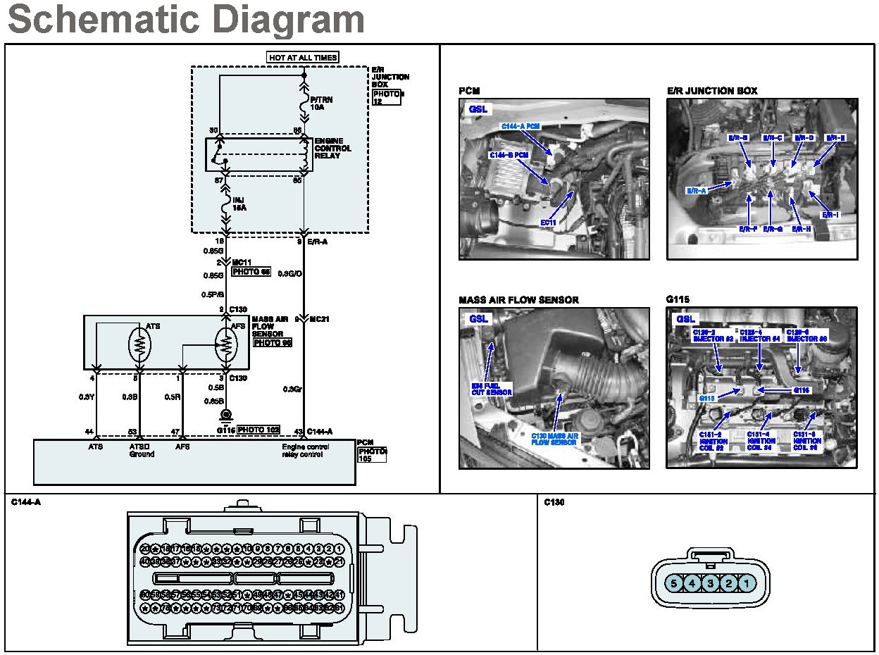 The Mass Air Flow Sensor (MAFS) is located between the air cleaner assembly and the throttle body. The MAFS uses a hot film type sensing element to measure the mass of intake air entering the engine. This hot film type air flow sensor consists of a hot film sensor, housing and metering ducts. Mass air flow rate is measured by detection of heat transfer from a hot film probe. The change in air flow rate causes change in the amount of heat being transferred from the hot film probe surface to the air. A large amount of intake air represents acceleration or high load conditions while a small amount of intake air represents deceleration or idle. The mass of intake air should increase at acceleration and be stable during constant engine speed. The ECM uses this information to determine the injection duration and ignition timing for the desired air/fuel ratio.