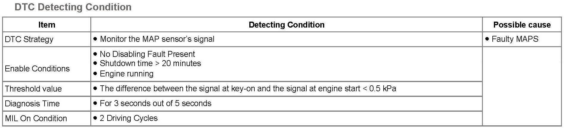 If the signal output of MAP sensor is stuck under enable conditions, ECM determines that a fault exists and a DTC is stored. MIL (Malfunction Indication Lamp) turns on when the malfunction lasts till consecutive 2 driving cycle.