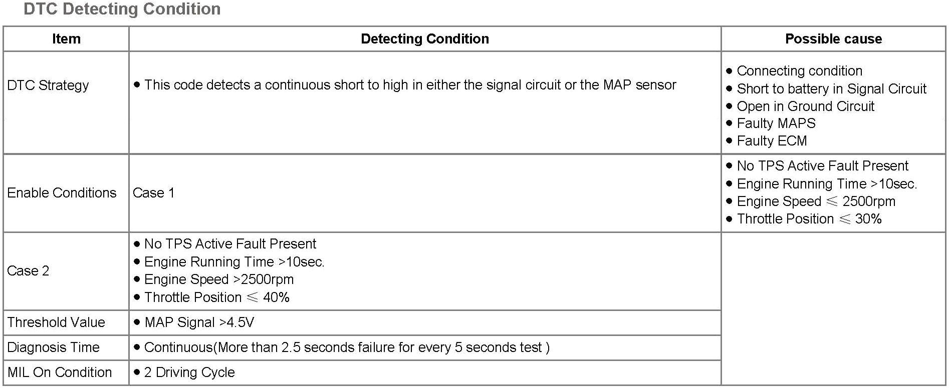 Checking output signals of MAPS every 5 sec. under detecting condition, if an output signal is above 4.5 V for more than 2.5 sec., ECM sets P0108. MIL (Malfunction Indication Lamp) turns on when the malfunction lasts till consecutive 2 driving cycle.