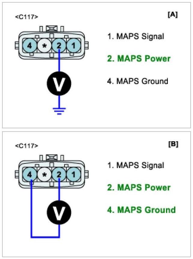 5. Measure the voltage between terminal 2 and 4 of MAPS harness connector.