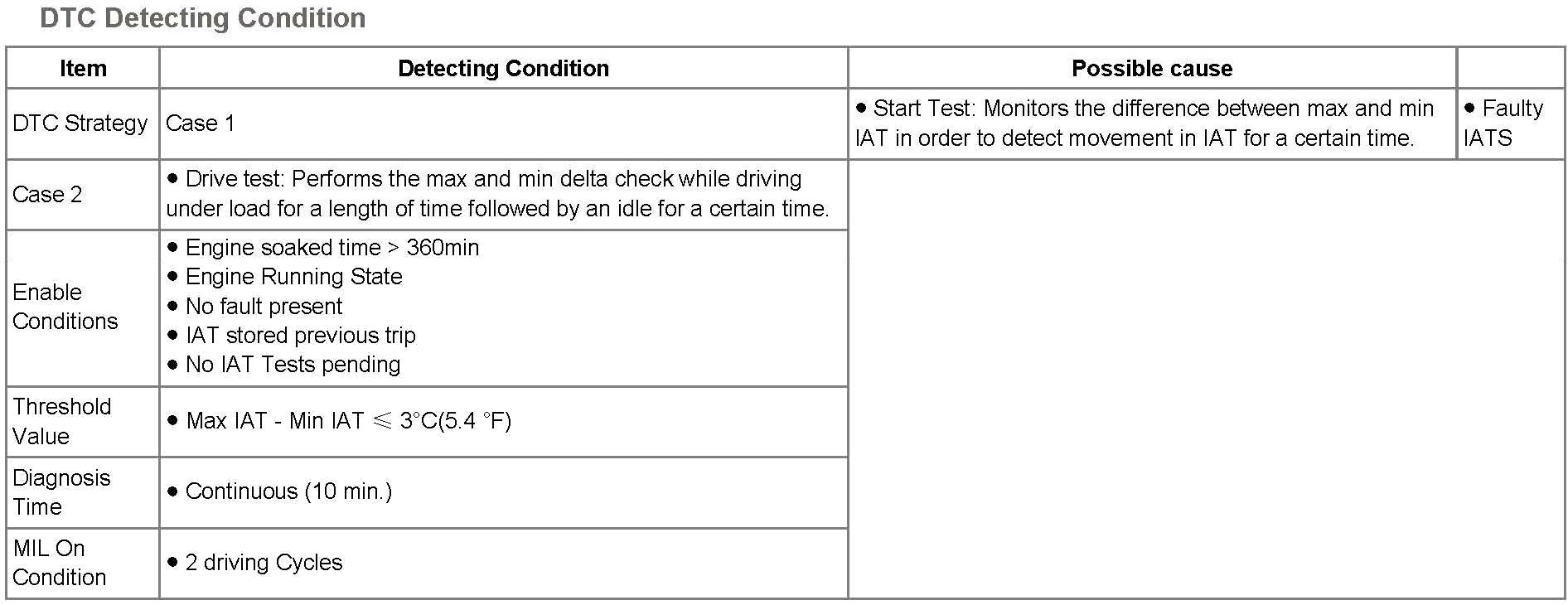ECM monitors temperature difference between MAX. and MIN IATS in order to detect movement in IATS not only Start Test but Drive Test while enable condition is met. If ECM detects intake air temperature changes less than 5.4 °F ECM determines that a fault exists and a DTC is stored. MIL (Malfunction Indication Lamp) turns on when the malfunction lasts till consecutive 2 driving cycle.