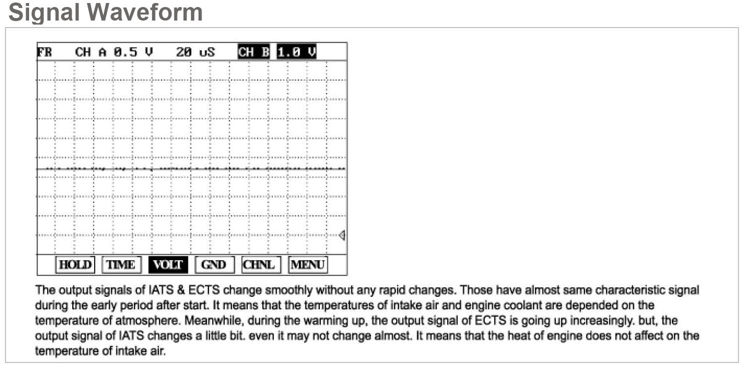 When the resistance value of the thermistor in IATS changes according to the intake air temperature, the signal voltage also changes. Using this signal, the information of the intake air temperature, the ECM corrects basic fuel injection duration and ignition timing.