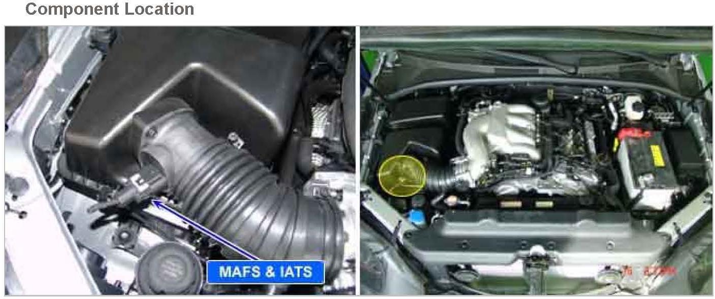 The Intake Air Temperature Sensor (IATS) is installed into the Mass Air Flow Sensor (MAFS). The IATS uses a thermistor whose resistance changes with the temperature. The electrical resistance of the IATS decreases as the temperature increases, and increases as the temperature decreases. The 5 V power source in the ECM is supplied to the IATS via a resistor in the ECM. That is, the resistor in the ECM and the thermistor in the IATS are connected in series.